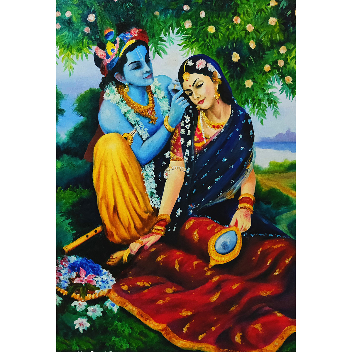 A beautifully lifelike depiction of Lord Krishna with Radha, symbolizing eternal love and divine harmony. The soft hues and graceful composition create a sense of serenity and joy. Perfect for spaces dedicated to devotion and romance in divinity.