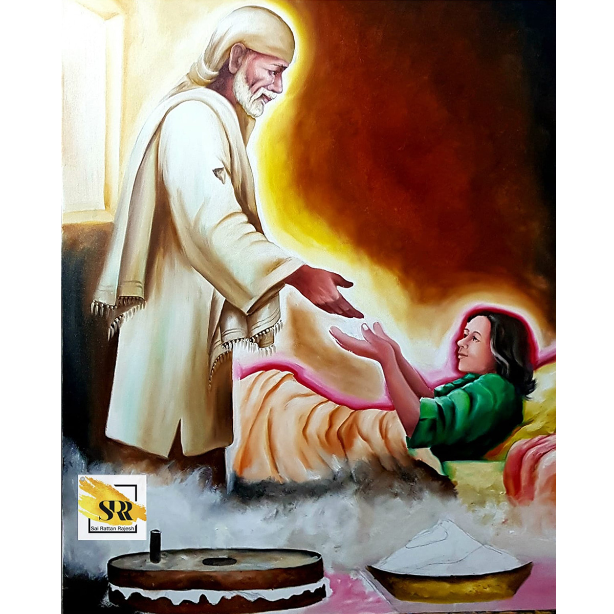 A heartfelt scene showing Sai Baba healing and helping devotees. The artwork’s realism captures compassion through expression and gesture. It reminds viewers of Sai Baba’s message of service and kindness toward all beings.