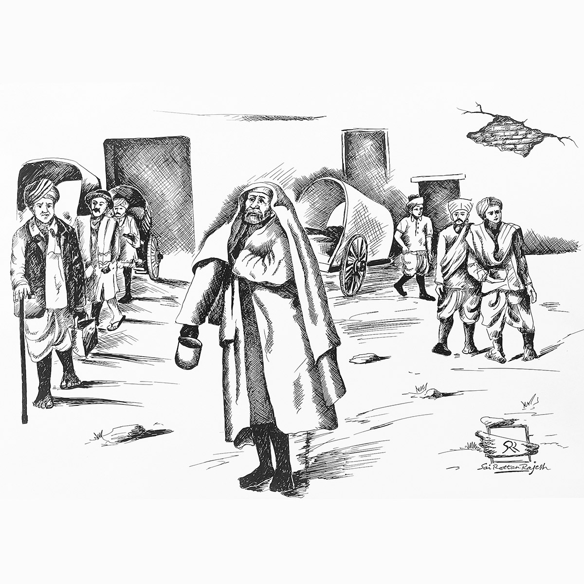 This sketch portrays Sai Baba with a gentle half-smile, using delicate pencil strokes and soft transitions. The facial lines are fine, with subtle shading giving the cheeks and forehead a three-dimensional feel. The simplicity of the background keeps all attention on his calm expression. It conveys a quiet grace and inner peace.