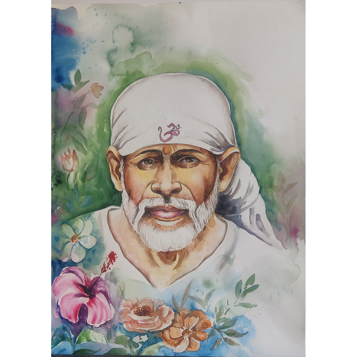 This watercolor portrait frames Sai Baba amidst delicate blossoms, each petal rendered in soft hues that convey serenity and spiritual grace.